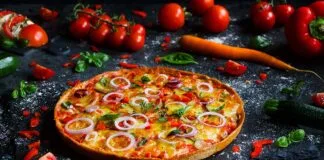 Pizza vegetariana – kolorowy talerz warzyw na cieście